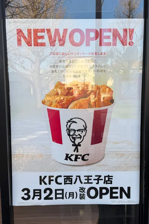 火災の影響で休業していた西八王子のKFCが、ついに3/2リニューアルオープン。あの香りと味が街に戻ってきます。近くの店舗の復活を待っていた人にはうれしいニュースです。