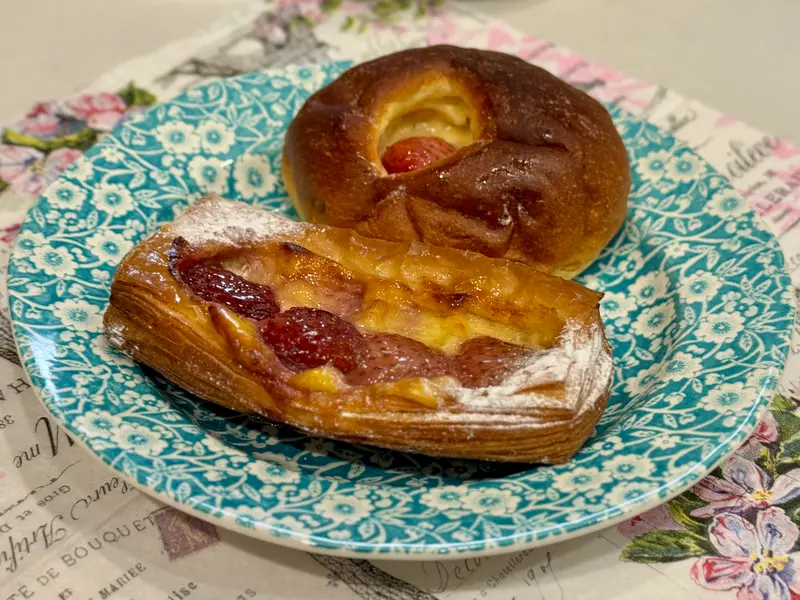 いただいたのは『大山の天然水いちご』を使った名物『飲むクリームパン』と『焼きいちごのデニッシュ』。たっぷりのクリームといちごの甘みが好相性で、サクッとしたデニッシュ生地にも果実の風味がしっかり感じられました。
