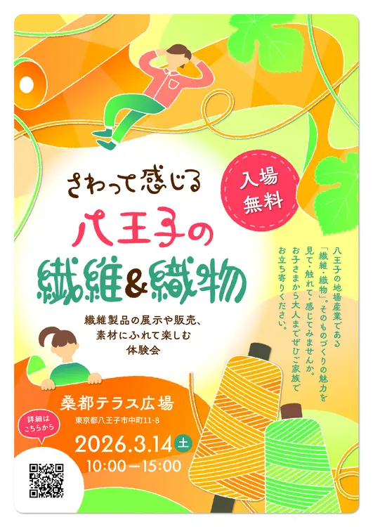 八王子の地場産業として長い歴史を持つ「繊維・織物」。かつて“桑都”と呼ばれたこのまちの原点にふれられるイベント『さわって感じる 八王子の繊維&織物』が、2026年3月14日(土)に桑都テラス広場で開催されます。製品の即売会や型染め体験など、見て・触れて・感じられる一日。入場無料で、子どもから大人まで楽しめます。