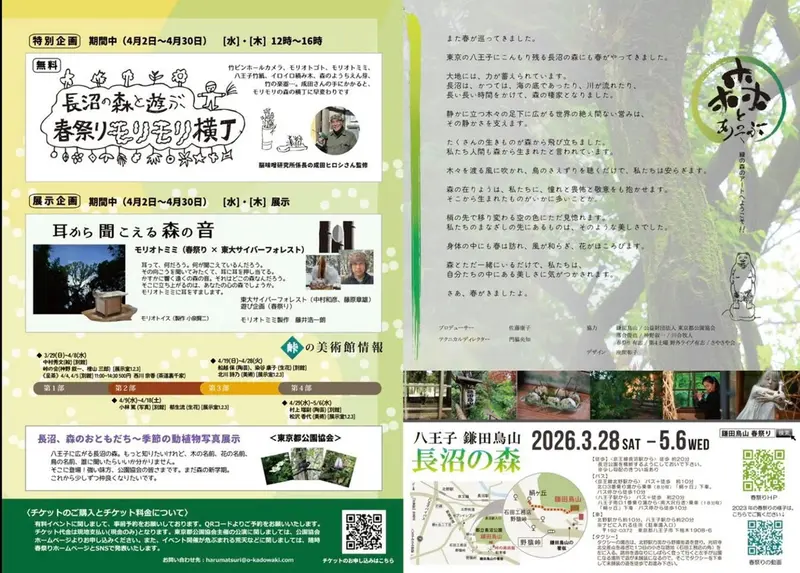 八王子・長沼の森にある鎌田鳥山と「峠の美術館」で、今年も「峠の美術館 春祭り」が開催されます。2026年は3月28日(土)〜5月6日(水)までの期間で実施され、森の自然とアートを楽しめるさまざまな企画が予定されています。