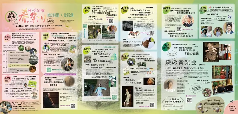 「春祭り」は「峠の美術館」を中心としたアート展示と、鎌田鳥山でのライブ・ワークショップなどが楽しめる森のアートイベント。都会の喧騒を離れ、長沼の森でゆったりとした時間を過ごすことができます。