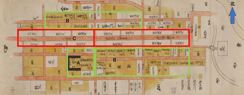 元禄時代(17世紀末)の八王子宿。A長安陣屋跡(推定)、B代官屋敷跡(推定)、C宿場(百姓屋敷) (八王子郷土資料館所蔵 新野家文書)。C宿場部分は大通りから裏通りまで幅2間から4間で細かく区画割されていた
