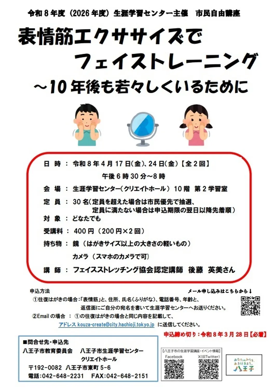 2026年4月17日(金)・24日(金)(全2回)18:30~20:00、生涯学習センター(クリエイトホール)で開催。定員30名、費用400円。申込締切は2026年3月28日(土)(必着)。詳細は下記の案内もしくは公式HPをご確認ください。